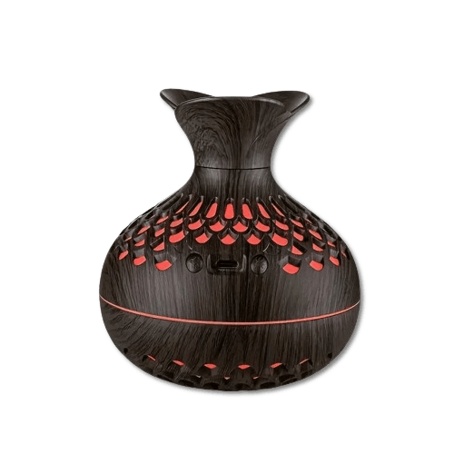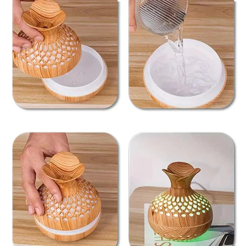 Diffuserens smukke træformede design passer ind i enhver indretning, og tilføjer et strejf af elegance og natur til dit hjem. Hvert element er nøje udvalgt for at give en æstetisk og afslappende oplevelse.