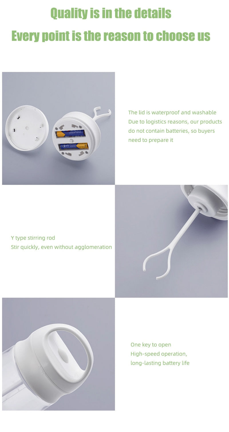 • Denne elektriske blenderflaske har god tætning, er lugtfri, lækagesikker og holdbar, lækker ikke mens den rystes på hovedet.