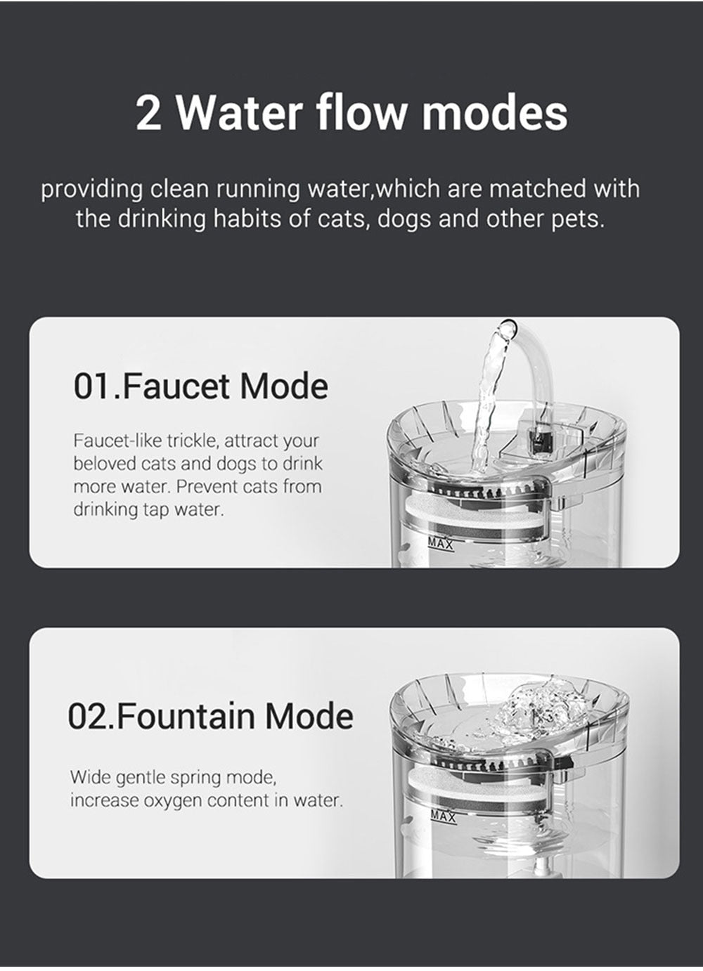 1.8L Kapacitet: Ingen grund til at genopfylde vandet ofte, og det kan dæmme drikke behovene for katte, hunde, fugle og andre kæledyr af forskellige størrelser. Ingen grund til at bekymre sig om, at dine kæledyr ikke får nok frisk drikke, når du går på arbejde.2 Vandstrøm tilstande (Hanemodus / Fontænemodus), der giver rent rindende vand, gør dine kæledyr lykkeligere og sundere.