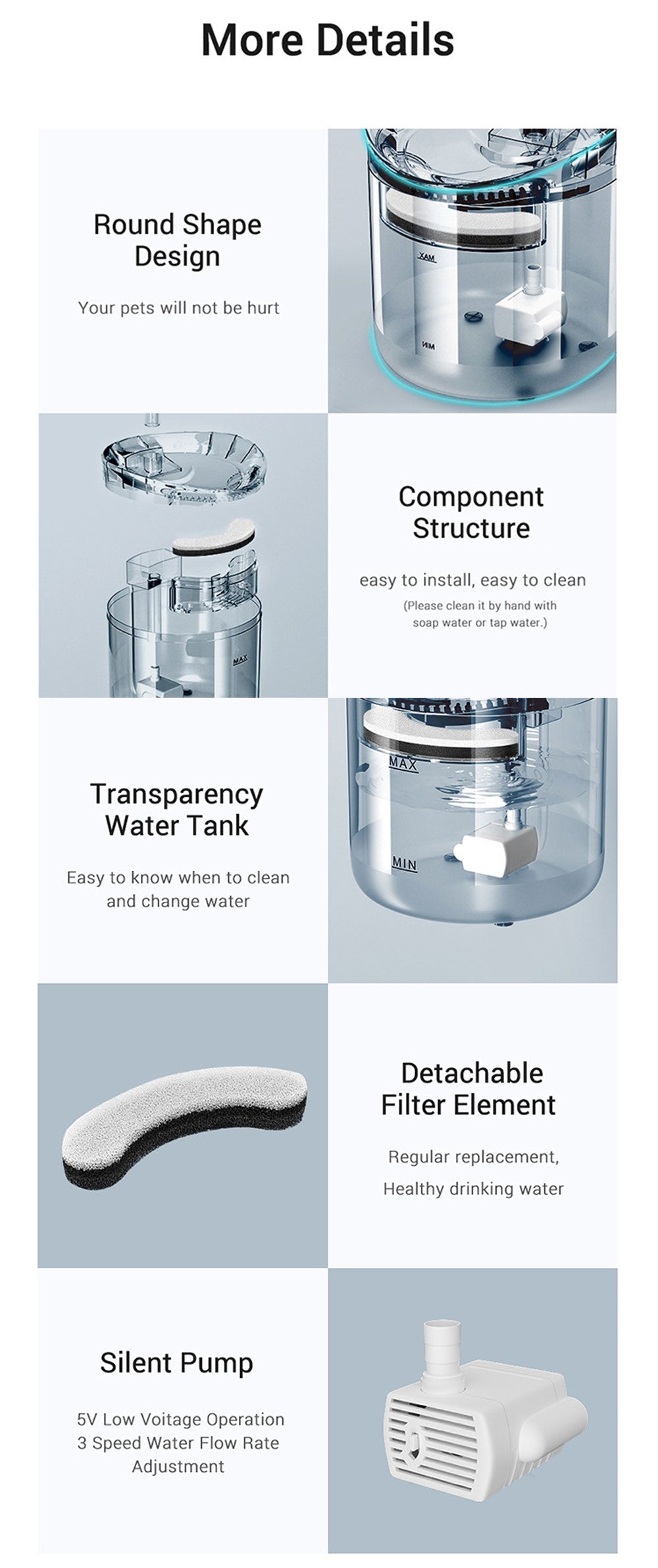 Det unikke udskiftelige designfilter kan effektivt filtrere hår, lugt og klor. Som følge heraf kan fontænen give renere vand til kæledyr og reducere risikoen for at udvikle sygdomme. Aktivkulfiltre hjælper med at fjerne, som absorberer lugte og dårlig smag.