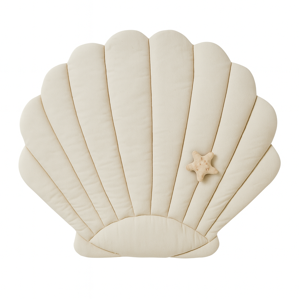 Skab det perfekte legeområde for din baby med vores charmerende, økologiske legeunderlag. Det er formet som en smuk muslingeskal og passer perfekt ind i ethvert moderne børneværelse eller boho-indretning. Med en blød overflade af 100% økologisk bomuld og en tyk fyldning af genanvendt polyester, tilbyder det komfort, sikkerhed og holdbarhed til kravletræning eller afslapning for småbørn. Det er let at håndtere og maskinvaskbart, hvilket gør det både praktisk og smukt.