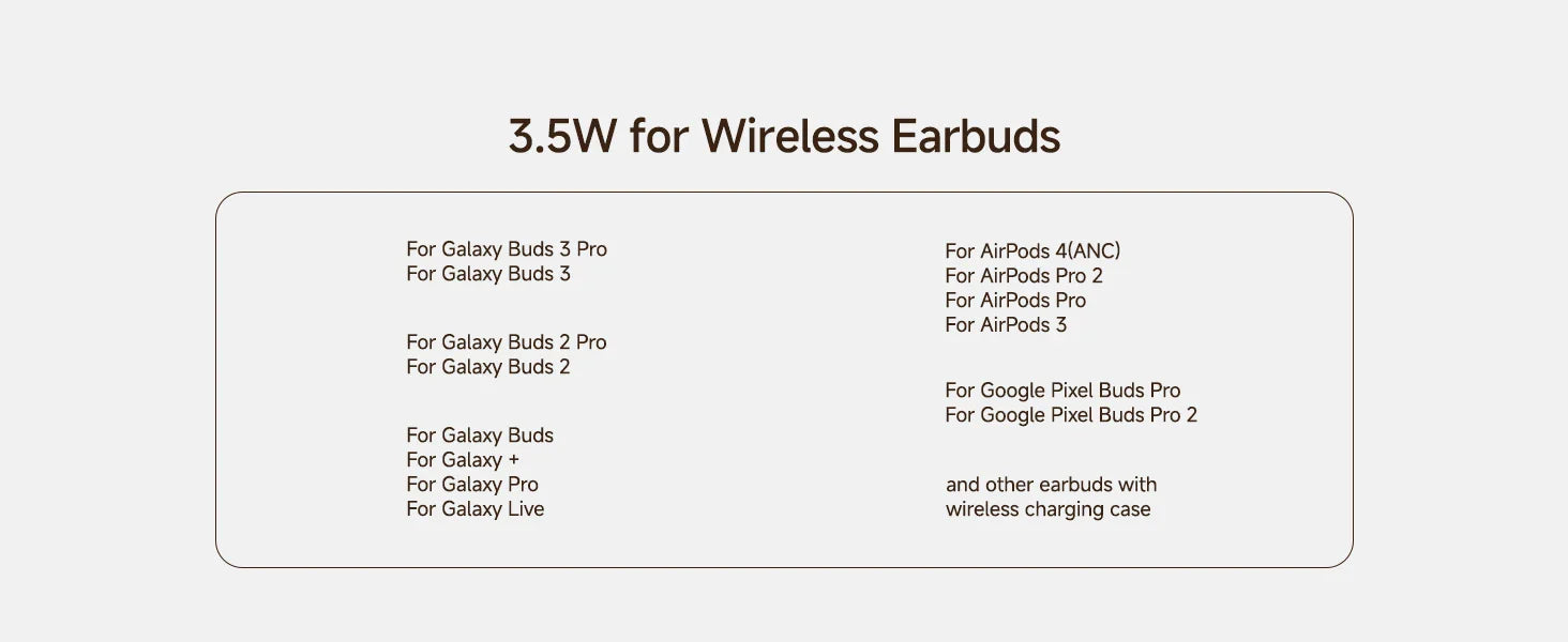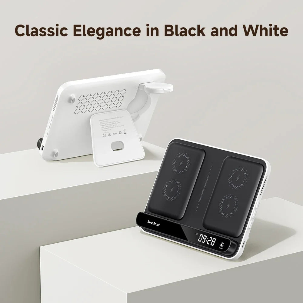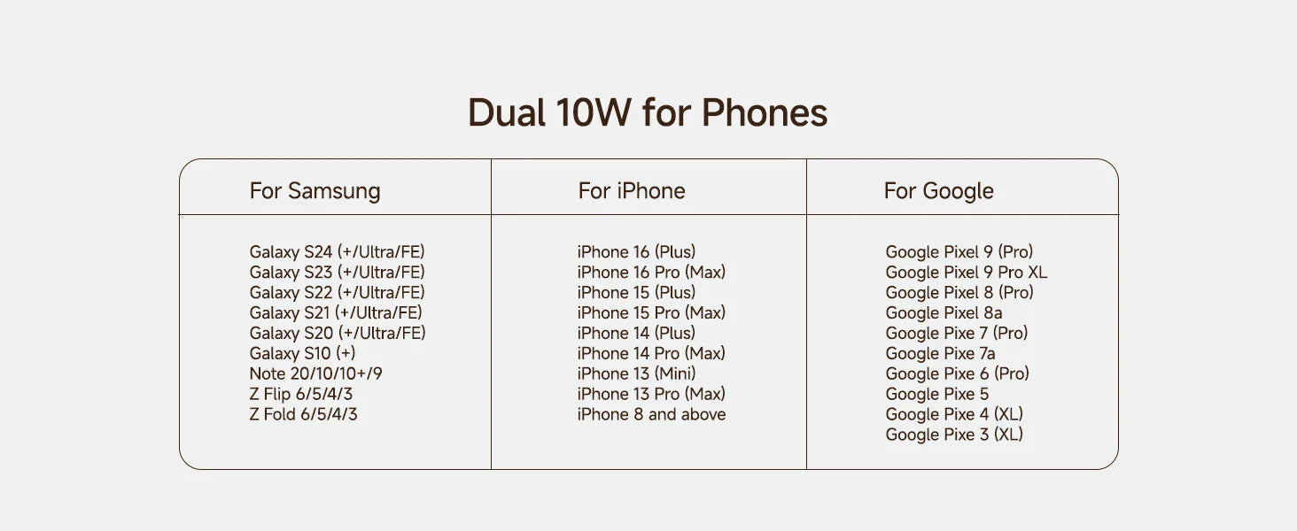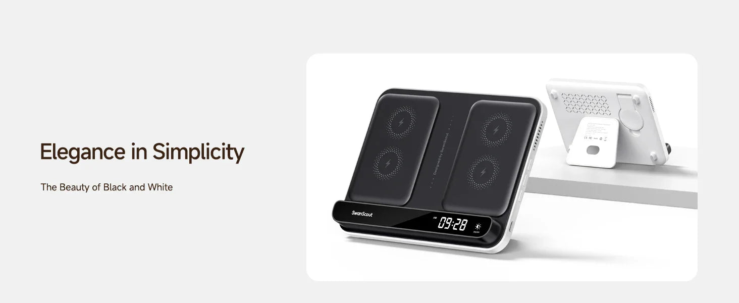 • Hurtig Opladning: Leverer op til 10W til telefoner og 3W til ure, hvilket sikrer, at dine enheder oplades hurtigt og effektivt, så du aldrig løber tør for strøm.