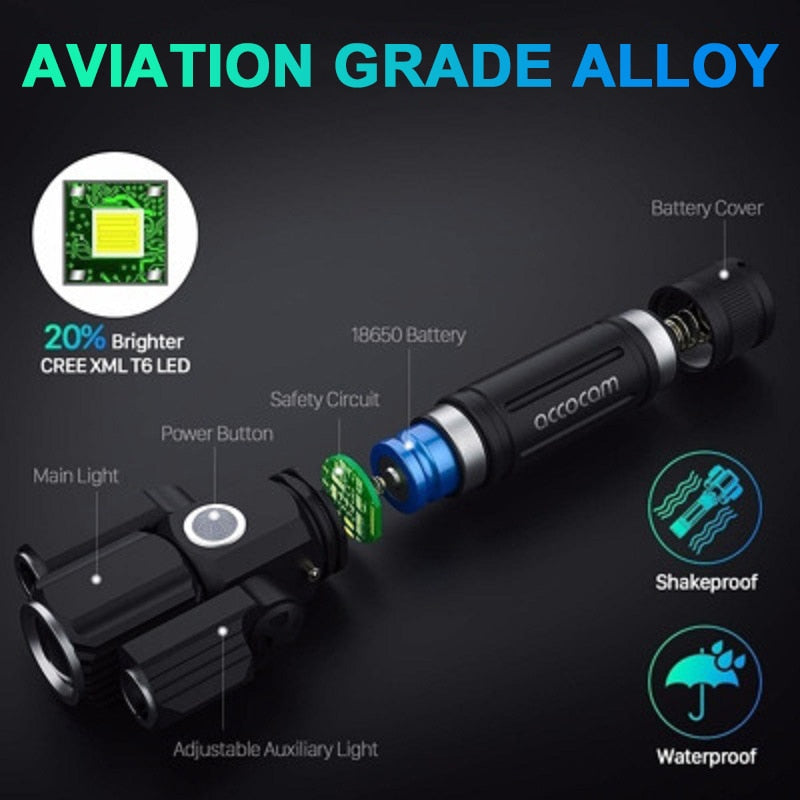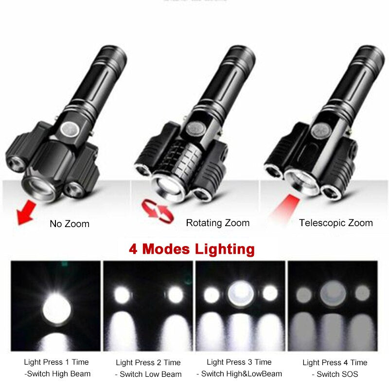 Den Tre Hoved Genopladelige Rotationslommelygte er en fantastisk måde at være forberedt på enhver situation. Den har tre forskellige lysindstillinger, og hovedet kan rotere 360 grader, så du har mere fleksibilitet, når det kommer til, hvor du vil rette dit lys.