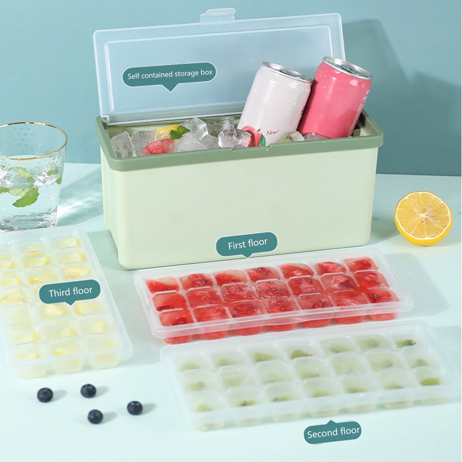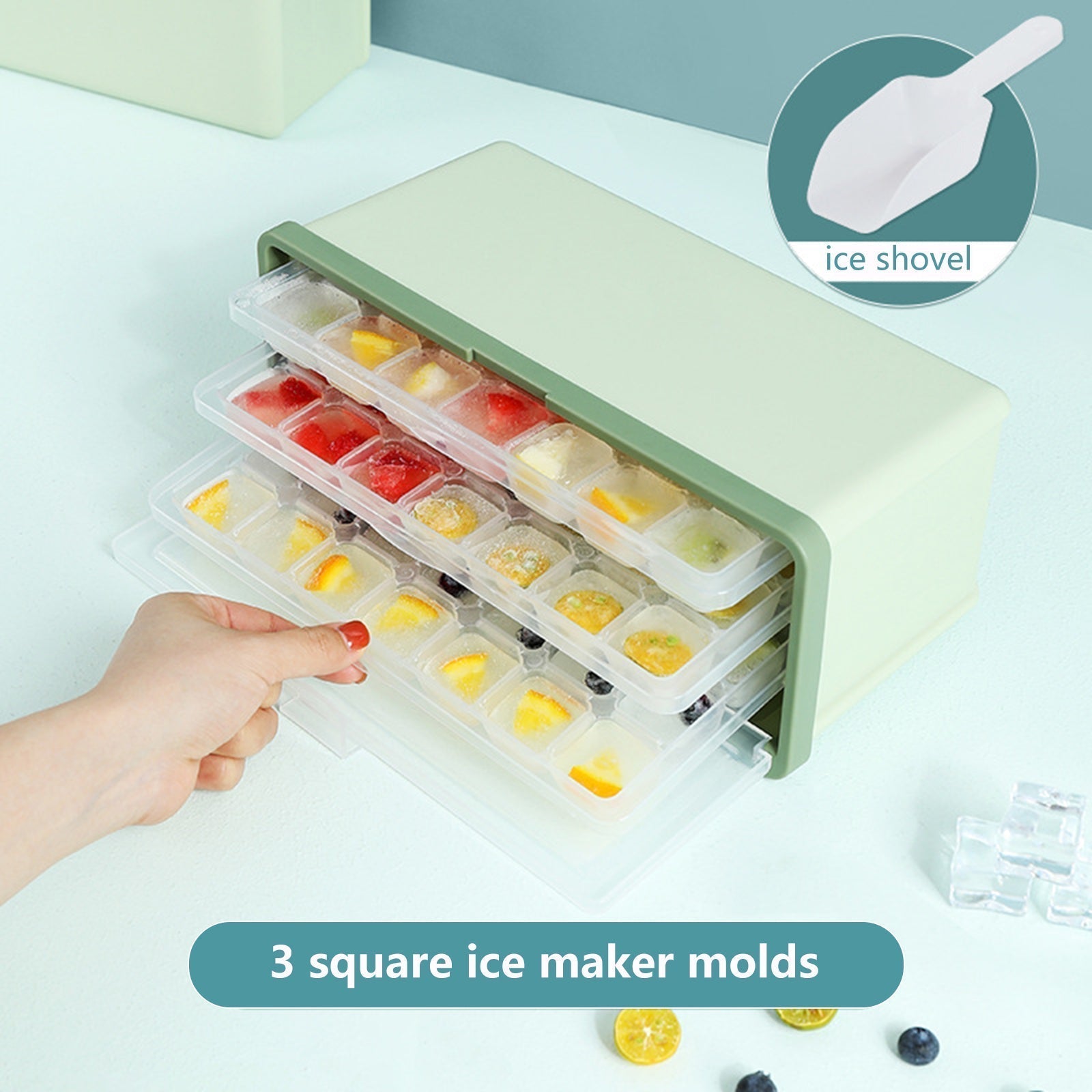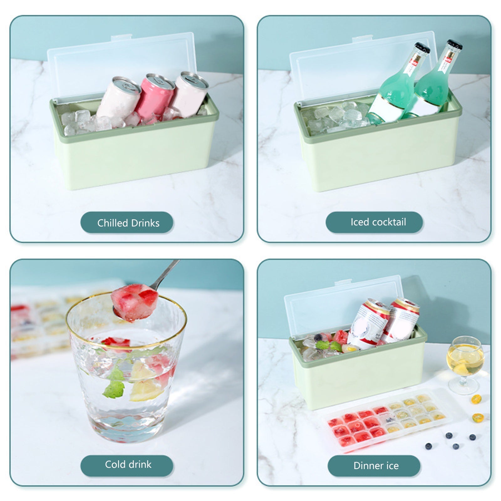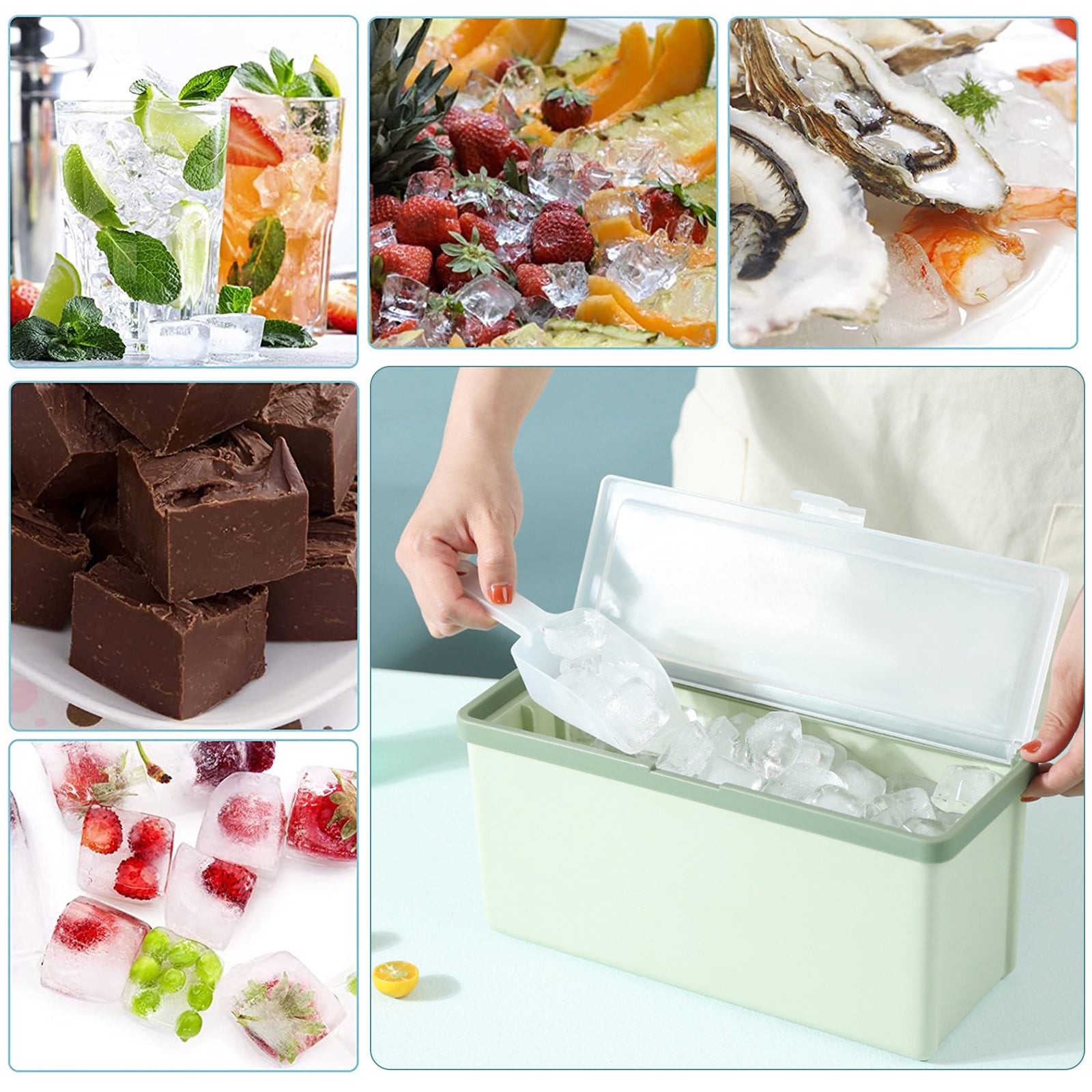 5 i 1: Produktet inkluderer 3 plastiske isterningbakker, en isterningsbeholder med låg og en is-ske, der er egnet til forskellige drikkevarer som vand, cocktails, whisky osv. Materialet er fødevaregodkendt og fri for BPA.