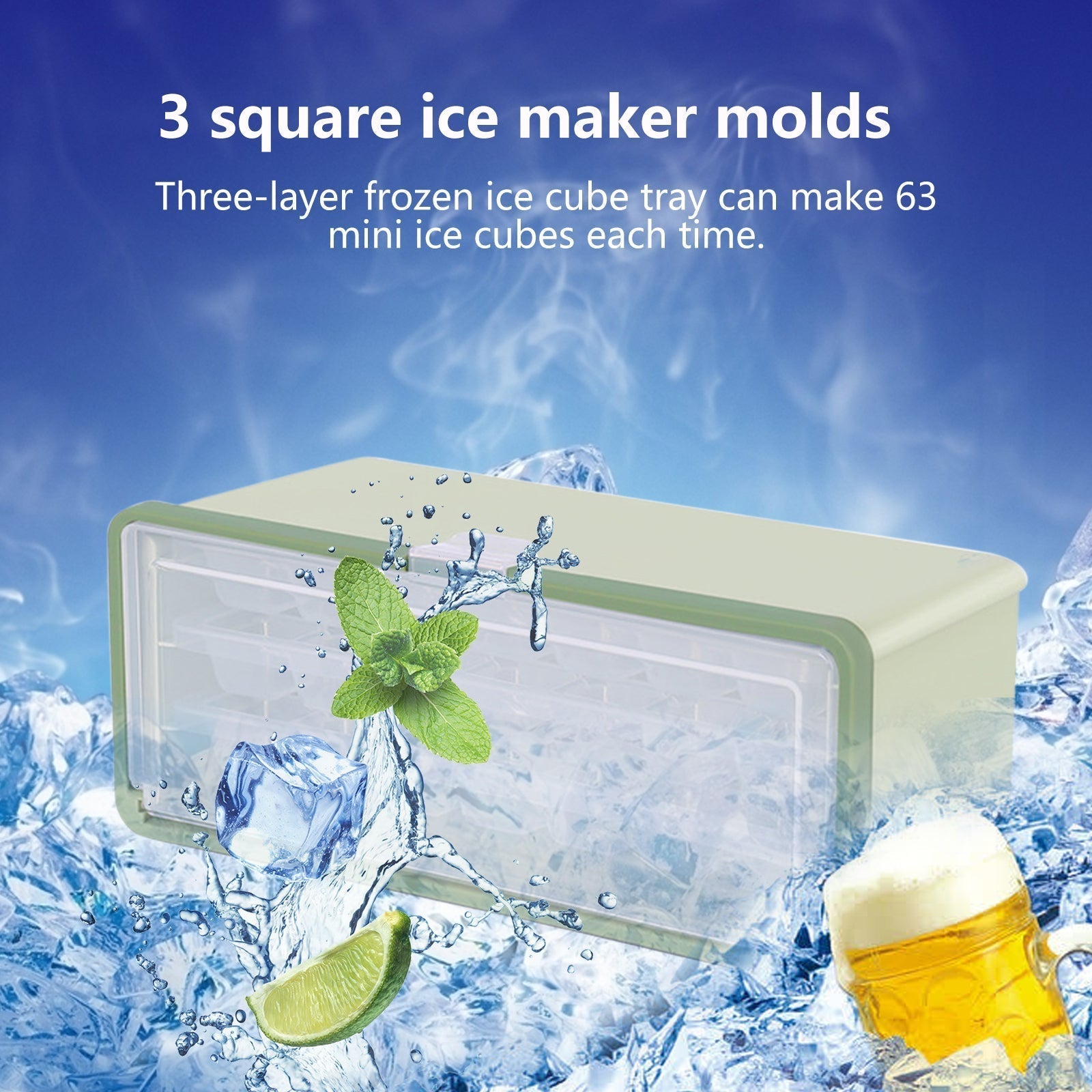 3 firkantede isproduktionsformer: 24.7*11.2cm/9.72*4.4tommer. Den tre-lags frosne isterningbakke laver 63 mini isterninger ad gangen. Stabelbare firkantede forme for nem udløsning af din isspand. Perfekt til campingvogne, forskellige familiebehov og fester.