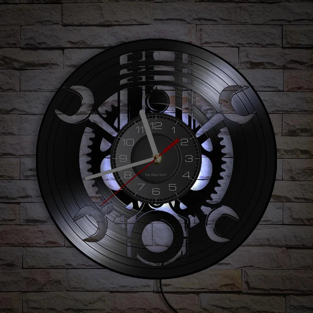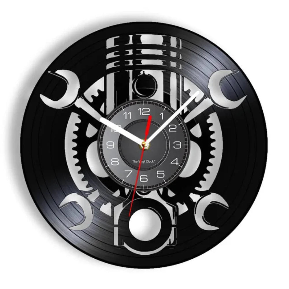 • Unikt Vinylkunst Design: Uret er kunstfærdigt udformet med værktøjsformede udskæringer, der skaber et iøjnefaldende samtaleemne.